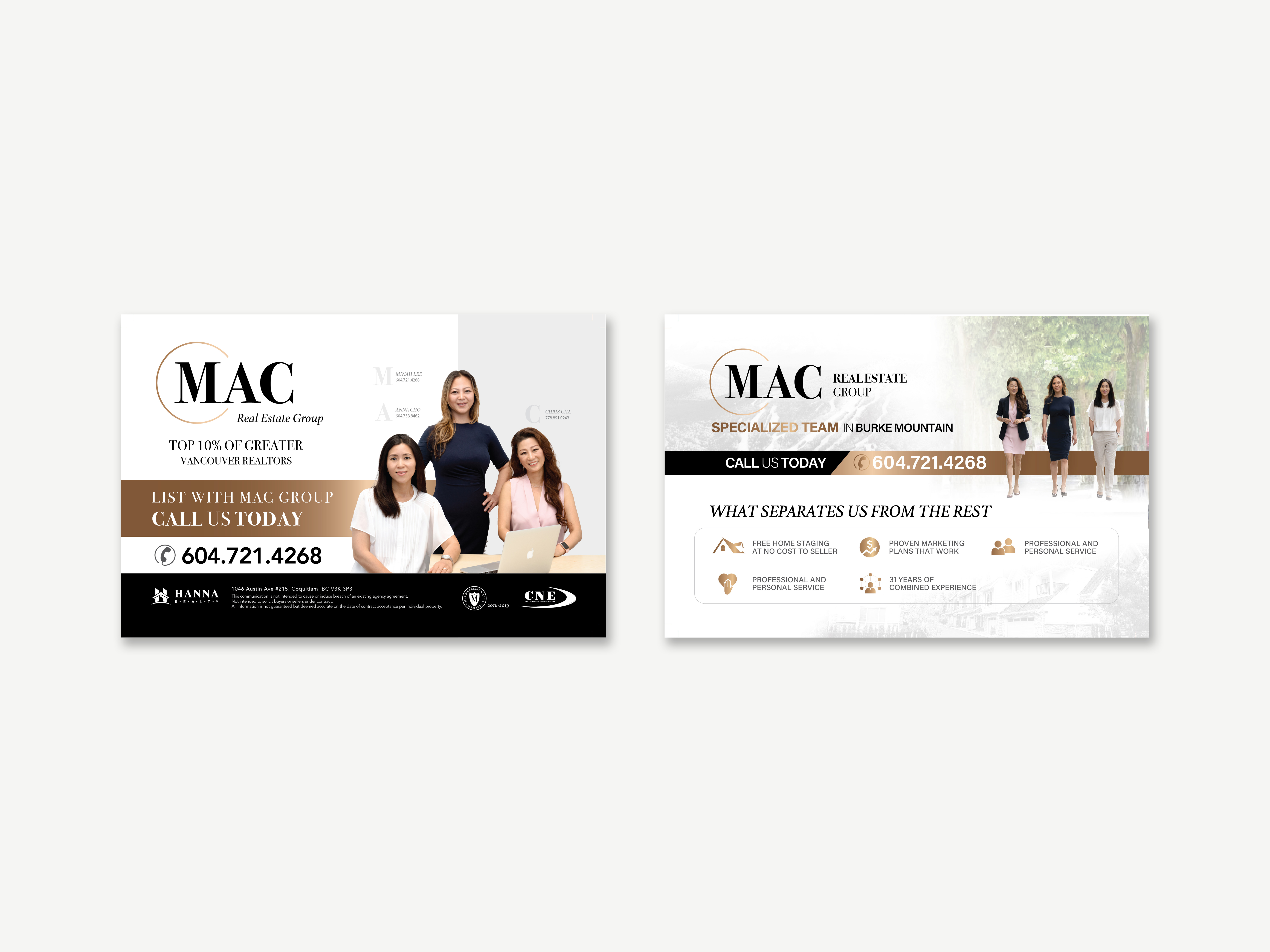 Minha Lee, Anna Cho, and Chris Cha—real estate agents based in British Columbia—commissioned a branding design project as part of their marketing under the MAC Real Estate Group. I was responsible for the branding direction and designed a postcard that featured a sophisticated gold color scheme to reflect their professionalism, while highlighting their expertise and niche focus within the real estate industry.